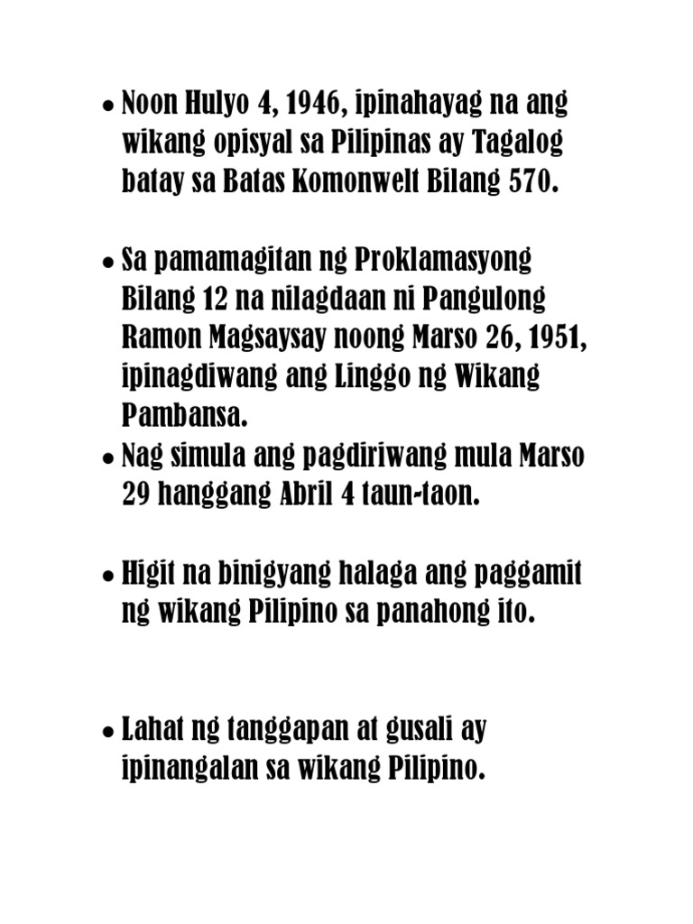 570 na ang Tagalog at Ingles ang mga wikang Opisyal wikang pinatibay ng batas na gagamitin ng pamahalaan sa pakikipagtalastasan sa kanyang mga mamamayang nasasakupan Nilagdaan ni Pangulong Ramon Magsaysay na ang Marso 29 Abril 4 ay. Noong 1959 ibinaba ng Kalihim Jose B. Abril 1 1940- Ipinalabas an Kautusang Tagapagpaganap na nagtatadhana ng pagpapalimbag ng isang balarila at isang diksyunaryo sa Wikang Pambansa.