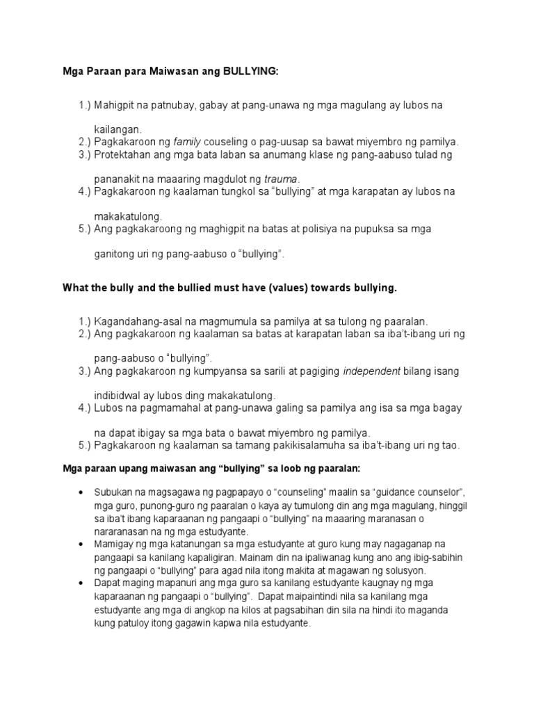 MGA SANHI NG BULLYING AT ANG EPEKTO NITO SA MAG-AARAL DE GUZMAN KRISTINE DE LEON JOANNA DUGAY LEVITA MARTIN CYRINNE TOLENTINO GERALDINE VALDEZ JENEVIE. Enero 2012 naman nang ipasa sa ikatlong pagbasa sa mababang kapulungan ang House Bill No. Sa lumalaking presensiya ng social networking platform sa internet ang cyber-bullying o online hurtful behavior ay nagpalawig sa saklaw ng bullying na nakakaapekto sa.