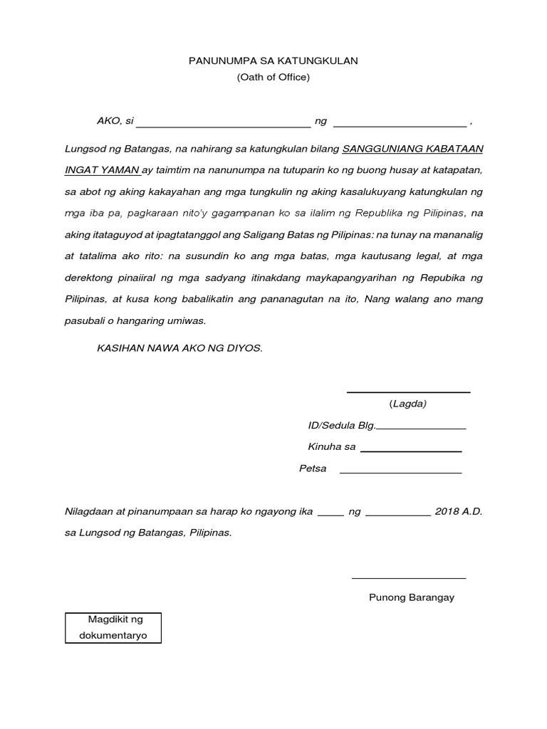 PANUNUMPA SA TUNGKULIN Ako si _____ ay inihalal sa katungkulan bilang _____ ay taimtim na nanunumpa na gagampanan ko nang buong katapatan ang tungkuling napaatang sa akin sa abot ng aking kakayahan.