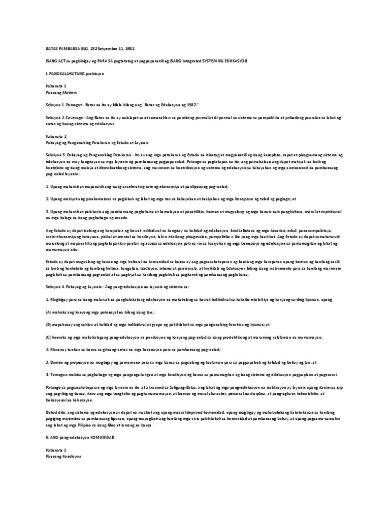 Batas pambansa 232 tagalog version Pages 1. This Act shall be known as the Education Act of 1982 SECTION 2. GENERAL PROVISIONS Chapter 1 PRELIMINARY MATTERS SECTION.