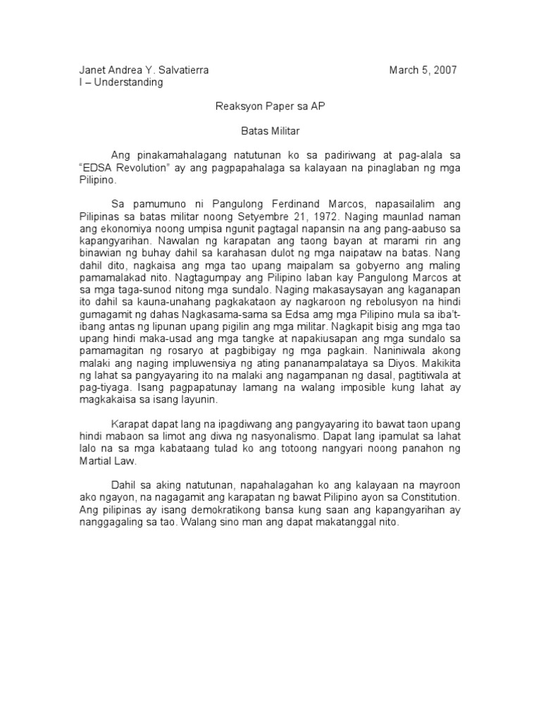 Batas militar reaction paper. Typically the imposition of martial law accompanies curfews the suspension of civil. This preview shows page 1 - 2 out of 2 pages. Ocampo Paolo Vincent G.